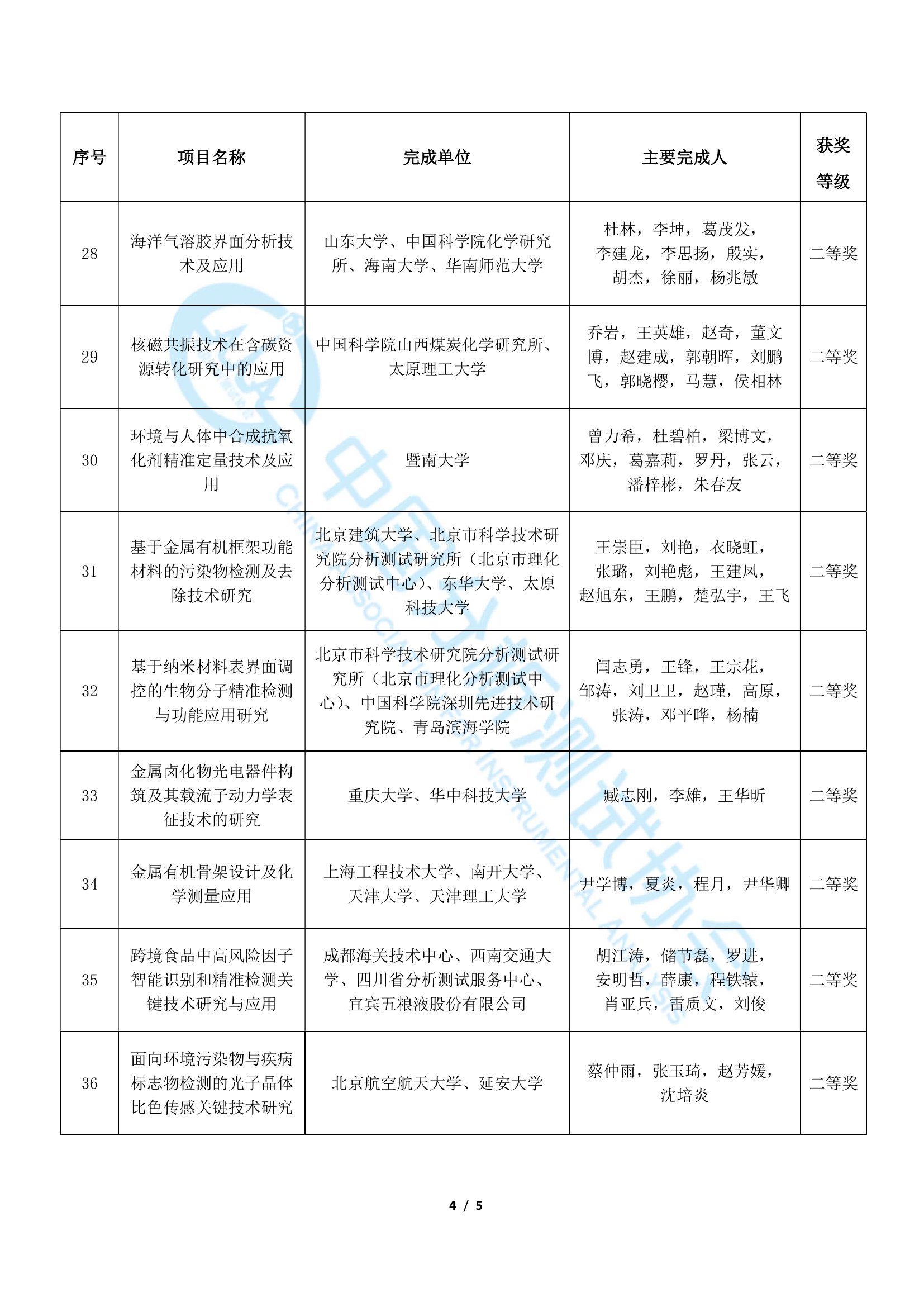 MOF限域催化與仿生信號放大協(xié)同構(gòu)建高性能生物傳感平臺、不銹鋼增材制造件缺陷激光超聲檢測技術(shù)研究與應(yīng)用、大氣吸光性氣溶膠在線離線耦合質(zhì)譜檢測方法及應(yīng)用等29個項目榮獲二等獎。