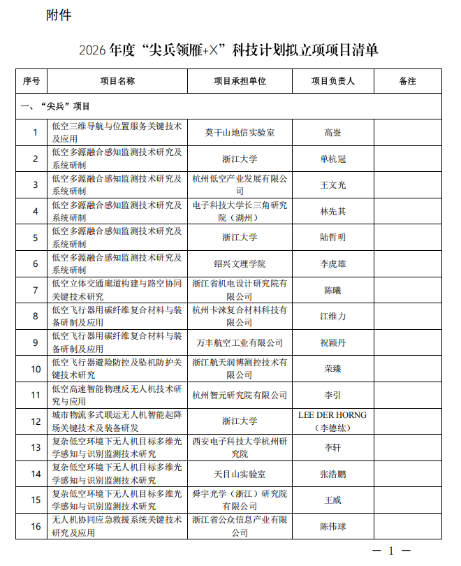 根據(jù)《浙江省科技創(chuàng)新規(guī)劃和科技計(jì)劃管理辦法(試行)》《浙江省重大科技計(jì)劃管理暫行辦法》《浙江省應(yīng)用基礎(chǔ)研究計(jì)劃項(xiàng)目管理辦法(試行)》等文件精神,現(xiàn)將“低空三維導(dǎo)航與位置服務(wù)關(guān)鍵技術(shù)及應(yīng)用”等476項(xiàng)擬立項(xiàng)的2026年度“尖兵領(lǐng)雁+X”科技計(jì)劃項(xiàng)目(含省地協(xié)同項(xiàng)目、省甬聯(lián)動項(xiàng)目、科技特派團(tuán)項(xiàng)目)予以公示(完整項(xiàng)目詳見附件清單)。“文化+科技”、深海智能領(lǐng)域項(xiàng)目另行公示。