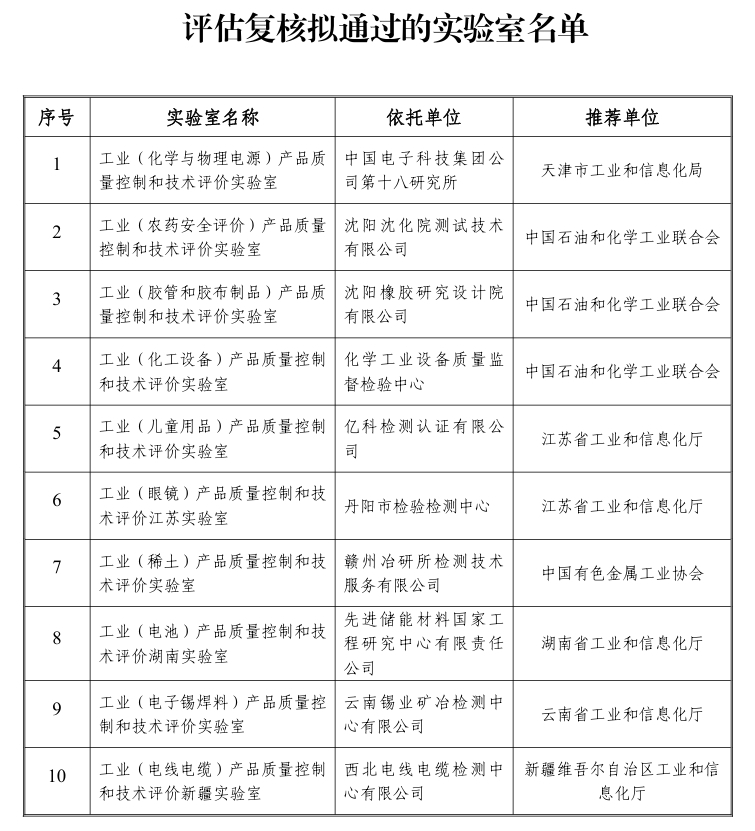 工業(yè)和信息化部公布工業(yè)產(chǎn)品質量控制和技術評價實驗室評估復核結果,10家實驗室符合評估復核通過條件,5家實驗室擬不再保留。