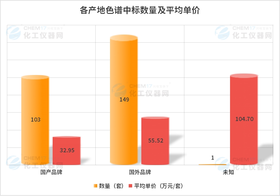 從“各產(chǎn)地色譜中標(biāo)數(shù)量及平均單價”來看,11月國產(chǎn)品牌色譜儀的中標(biāo)數(shù)量為103套,約占11月份色譜儀中標(biāo)總數(shù)量的40.71%,平均中標(biāo)單價約為32.95萬元/套;國外品牌色譜儀的中標(biāo)數(shù)量為149套,約占11月份色譜儀中標(biāo)總數(shù)量的58.89%,平均中標(biāo)單價約為55.52萬元/套;未知產(chǎn)地品牌色譜儀的中標(biāo)數(shù)量為1套,平均中標(biāo)單價約為104.7萬元/套。