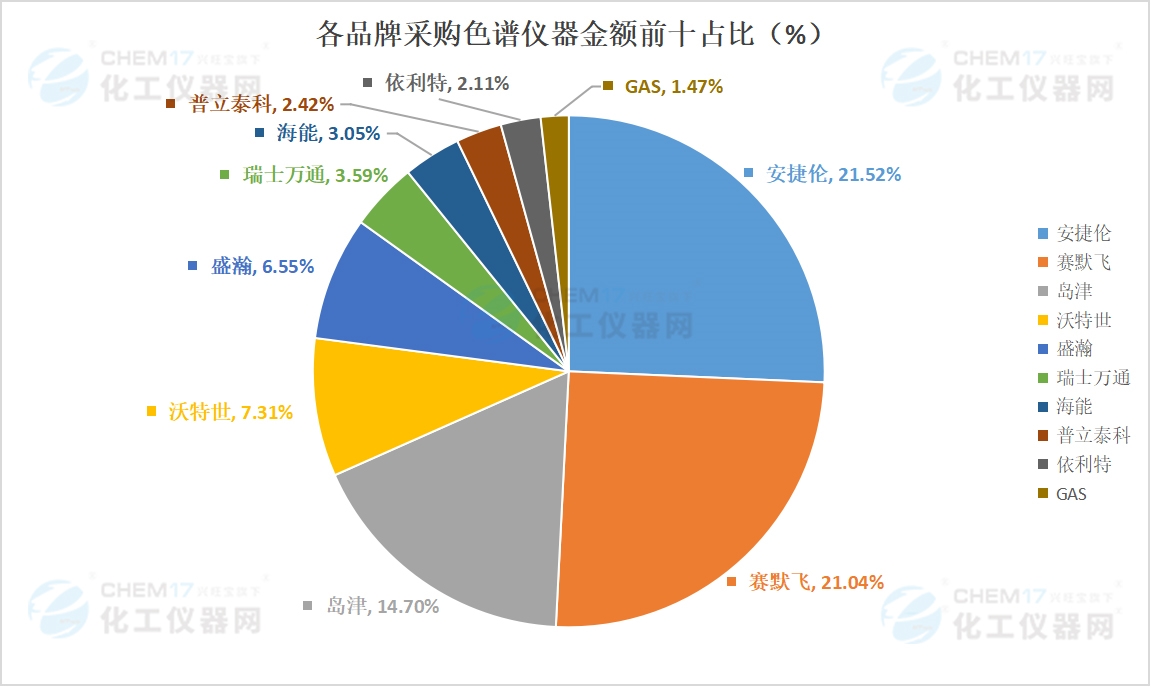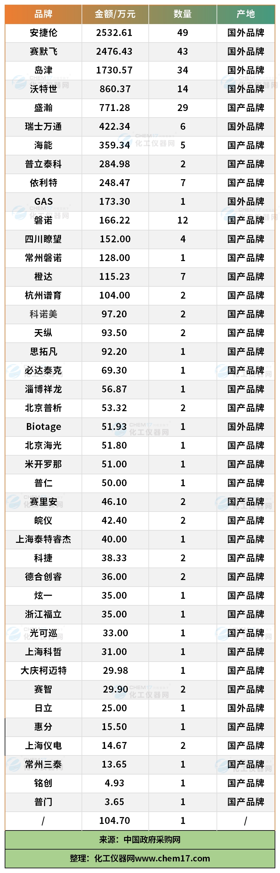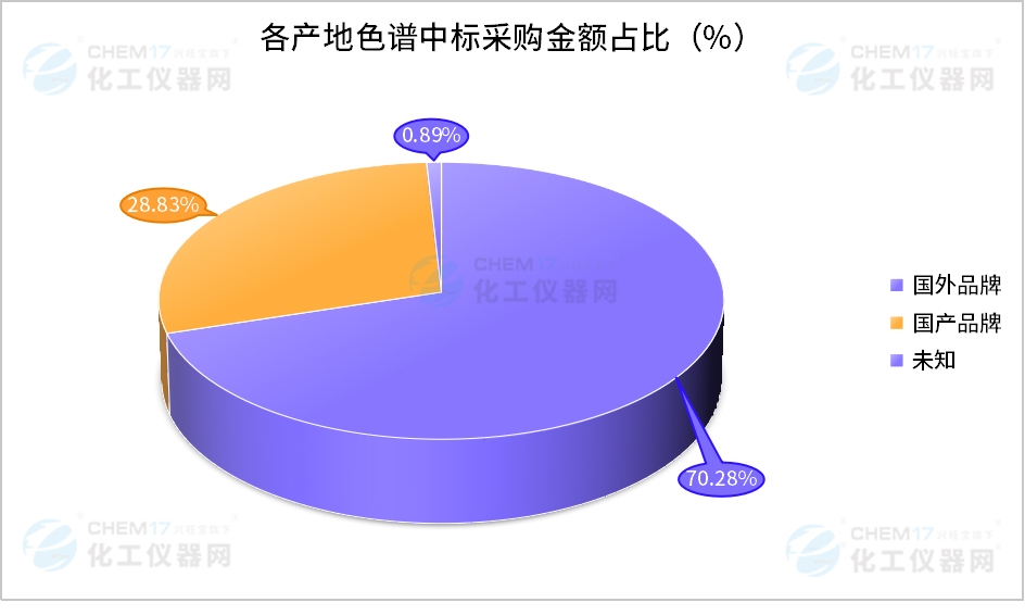 從“各產(chǎn)地色譜中標(biāo)采購金額占比”數(shù)據(jù)來看,11月國產(chǎn)品牌色譜儀的中標(biāo)金額為3393.82萬元,約占11月色譜儀中標(biāo)總金額的28.83%;11月國外品牌色譜儀的中標(biāo)金額為8272.55萬元,約占11月色譜儀中標(biāo)總金額的70.28%;未知產(chǎn)地色譜儀的中標(biāo)金額為104.70萬元,約占11月色譜儀中標(biāo)總金額的0.89%。