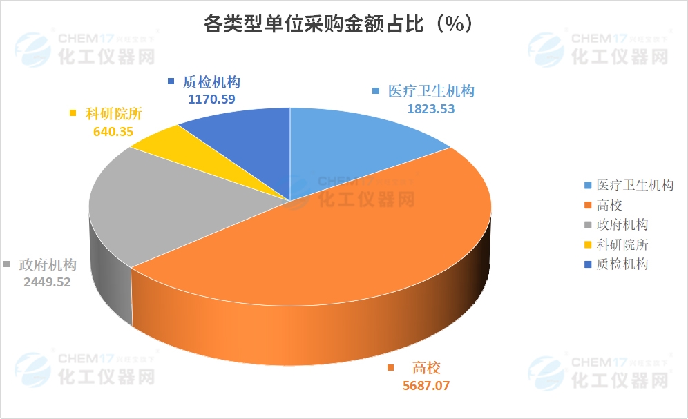 醫(yī)療衛(wèi)生機(jī)構(gòu)采購數(shù)量為36套,采購金額為1823.53元,約占11月色譜儀采購總金額的15.49%;政府機(jī)構(gòu)采購數(shù)量為68套,采購金額為2449.52萬元,約占11月色譜儀采購總金額的20.81%;科研院所采購數(shù)量為12套,采購金額為640.35萬元,約占11月色譜儀采購總金額的5.44%;質(zhì)檢機(jī)構(gòu)采購數(shù)量為17套,采購金額為1170.59萬元,約占11月色譜儀采購總金額的9.94%。