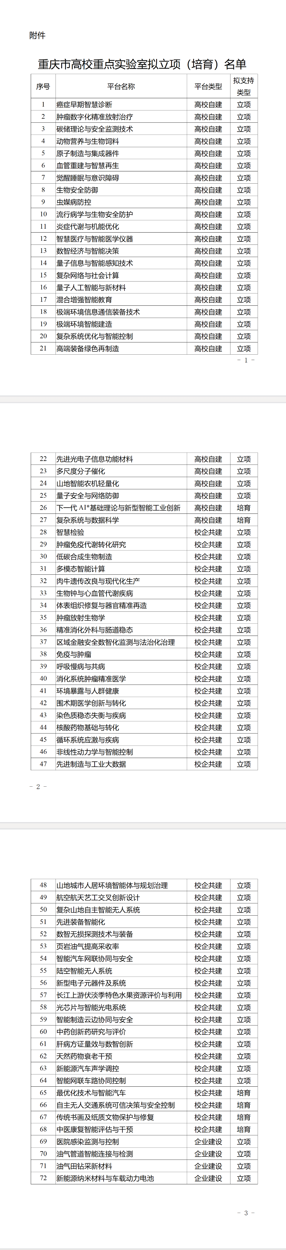 72項 重慶市高校重點實驗室擬立項(培育)名單公示