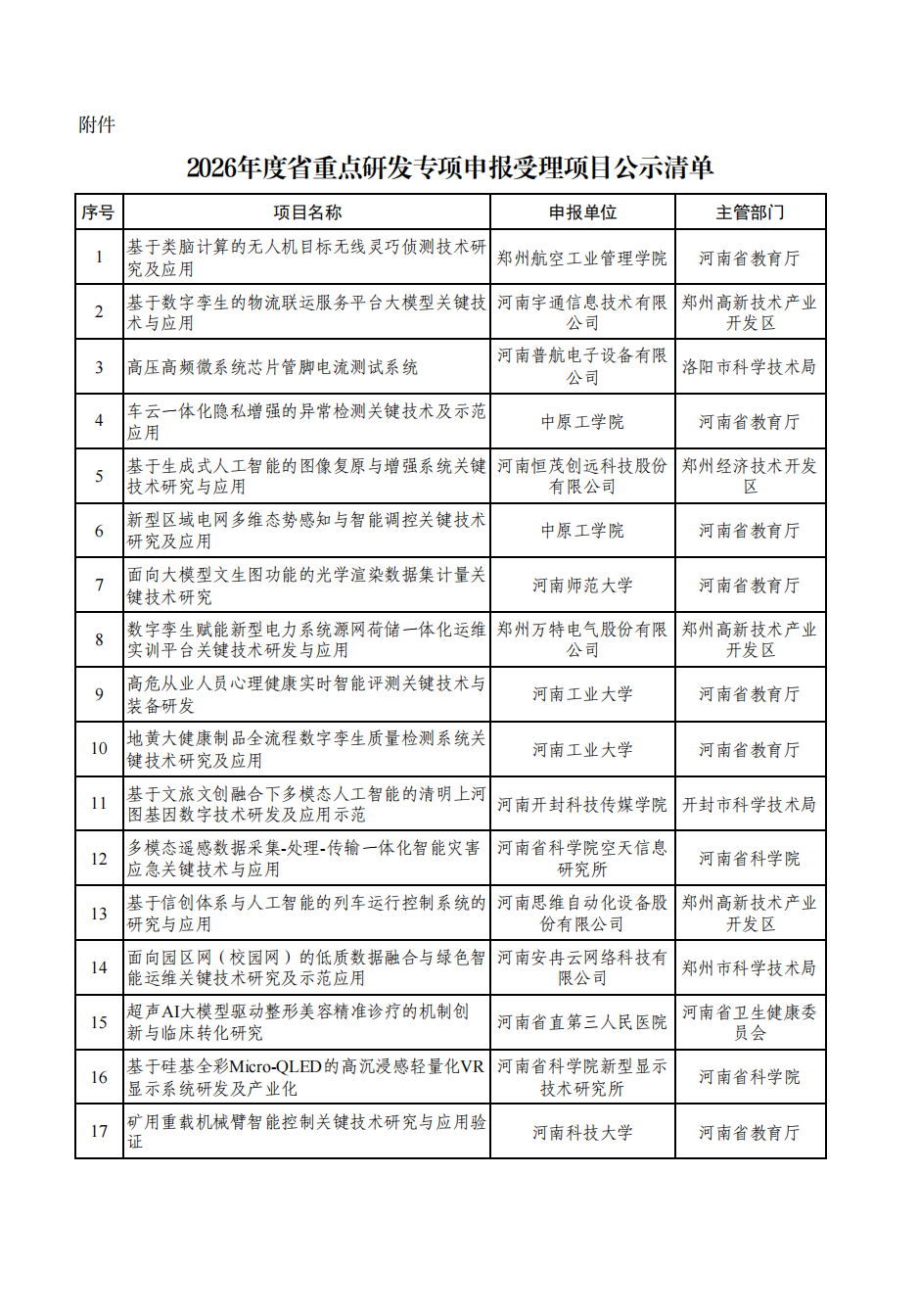 2026年度河南省重點(diǎn)研發(fā)專項(xiàng)項(xiàng)目受理公示