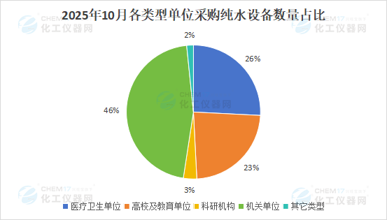 根據(jù)化工儀器網(wǎng)不完全統(tǒng)計(jì),10月醫(yī)療衛(wèi)生單位采購(gòu)純水設(shè)備32套/臺(tái),采購(gòu)數(shù)量占比25.81%,采購(gòu)金額達(dá)315.3472萬(wàn)元,占中標(biāo)總金額的23.94%;高校及教育單位采購(gòu)純水設(shè)備29套/臺(tái),采購(gòu)數(shù)量占比達(dá)到了23.39%,采購(gòu)金額達(dá)292.91萬(wàn)元,占中標(biāo)總金額的22.24%;科研機(jī)構(gòu)采購(gòu)純水設(shè)備4套/臺(tái),采購(gòu)數(shù)量占比達(dá)到了3.23%,采購(gòu)金額達(dá)17.57萬(wàn)元,占中標(biāo)總金額的1.33%;機(jī)關(guān)單位采購(gòu)純水設(shè)備57套/臺(tái),采購(gòu)數(shù)量占比達(dá)到了45.97%,采購(gòu)金額達(dá)673.27萬(wàn)元,占中標(biāo)總金額的51.12%;其它類型單位采購(gòu)純水設(shè)備2套/臺(tái),采購(gòu)數(shù)量占比達(dá)到了1.61%,采購(gòu)金額達(dá)17.93萬(wàn)元,占中標(biāo)總金額的1.36%。
