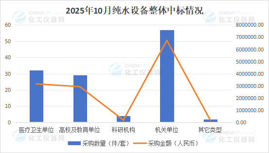結(jié)合“2025年10月各類型單位采購(gòu)純水設(shè)備金額占比”與“2025年10月各類型單位采購(gòu)純水設(shè)備數(shù)量占比”和“2025年10月純水設(shè)備整體中標(biāo)情況”三項(xiàng)數(shù)據(jù)來(lái)看,機(jī)關(guān)單位采購(gòu)純水設(shè)備的數(shù)量最多,達(dá)到了57套/臺(tái),并且采購(gòu)總金額要明顯高于其它類型的采購(gòu)單位。其中,來(lái)自海關(guān)單位的采購(gòu)多達(dá)45套/臺(tái),而從采購(gòu)項(xiàng)目名稱及采購(gòu)需求明細(xì)等信息來(lái)看,造成這種情況的一個(gè)重要原因是“兩新”政策的持續(xù)推進(jìn)。