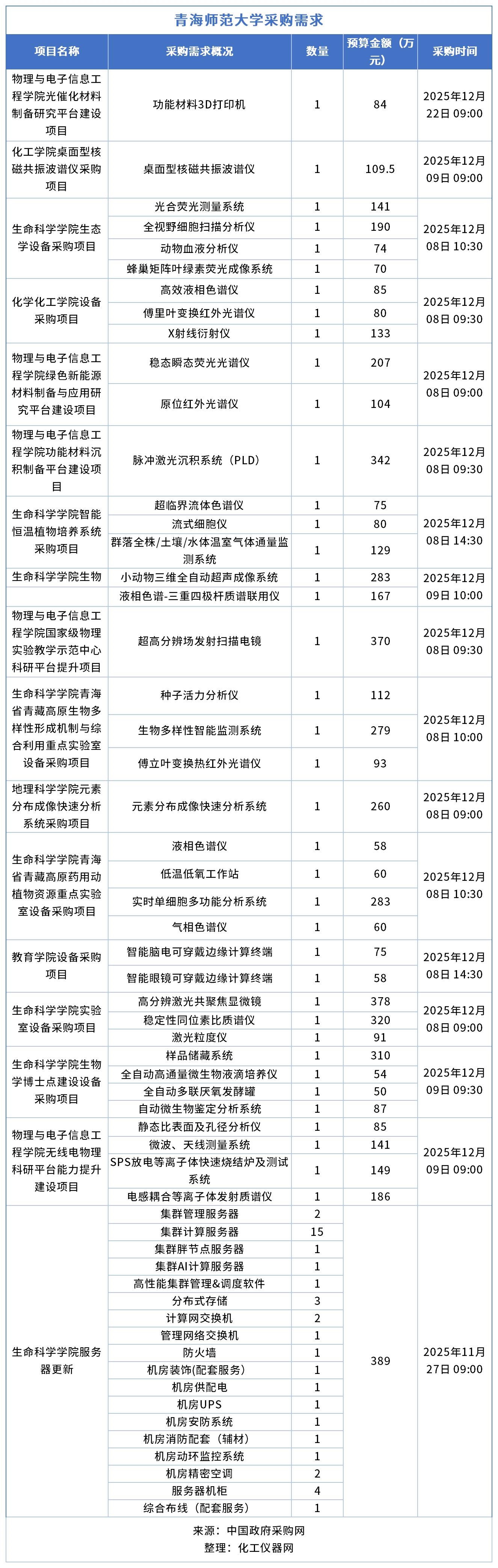 青海省政府采購中心依據(jù)青海省財政廳下達的采購計劃,擬對“青海師范大學2025年教學科研儀器設備更新項目”進行國內(nèi)公開招標,總預算6301.5萬元。