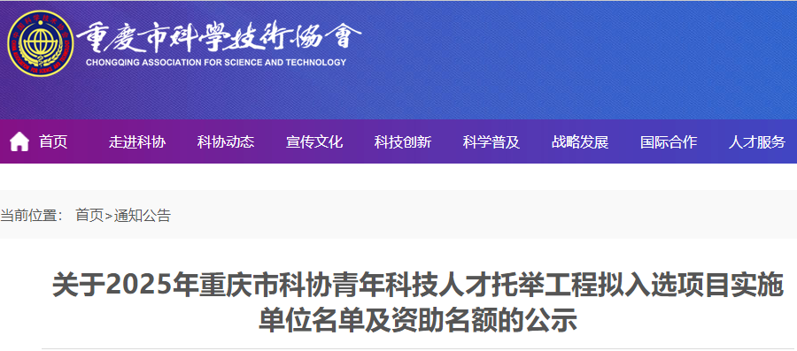 關(guān)于2025年重慶市科協(xié)青年科技人才托舉工程擬入選項(xiàng)目實(shí)施單位名單及資助名額的公示