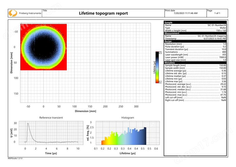 | 碳化硅外延片(>10μm)-少數(shù)載流子壽命mapping圖(平均壽命τ=0.36μs) | |