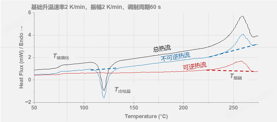 PET聚酯因其可快速結(jié)晶的特性,成為瓶片、纖維等領(lǐng)域的重要材料。其制品性能高度依賴于加工過程中的結(jié)晶行為。通過DSC可精準(zhǔn)捕捉其玻璃化轉(zhuǎn)變和熔融行為,從而優(yōu)化熱成型溫度等工藝參數(shù),保障產(chǎn)品性能。借助DSC Starry的MDSC功能,可分離PET聚酯在50~300 °C溫區(qū)的可逆/不可逆熱流信號:通過可逆熱流精準(zhǔn)解析玻璃化轉(zhuǎn)變溫度和熔融吸熱,同時呈現(xiàn)不可逆熱流中的冷結(jié)晶等各類非平衡過程的熱歷史。