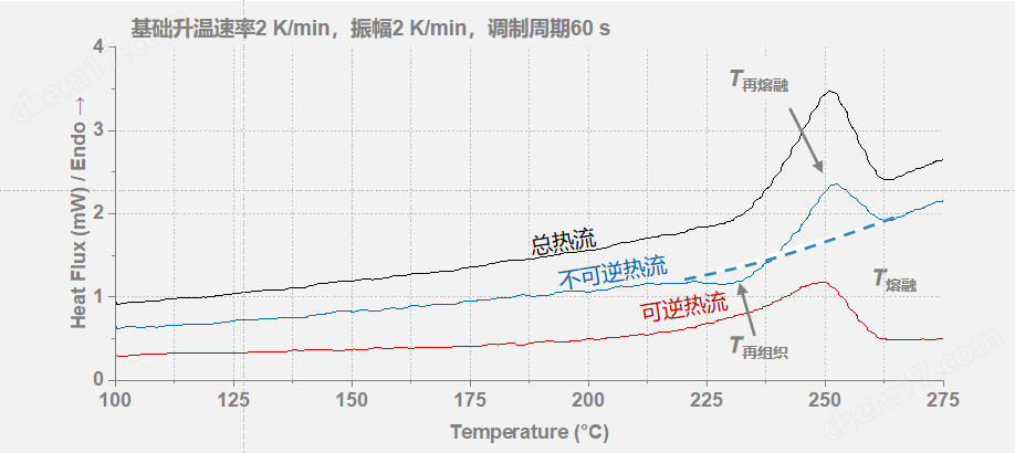 尼龍66憑借其氫鍵主導(dǎo)的規(guī)整排列與酰胺鍵極性,展現(xiàn)出較高的拉伸強(qiáng)度與良好的耐熱性,成為汽車部件及電子連接器等結(jié)構(gòu)件的關(guān)鍵材料。DSC Starry憑借其MDSC功能,可分離尼龍66在連續(xù)升溫過程中的的可逆與不可逆熱流信號:通過可逆熱流精準(zhǔn)解析其熔融行為,同時在不可逆熱流中清晰捕獲“再組織-熔融”動態(tài)過程。
