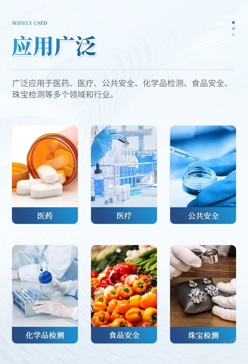 適用于現(xiàn)場(chǎng)快速檢測(cè),廣泛應(yīng)用于醫(yī)藥、公共安全、化學(xué)品檢測(cè)、食品安全、珠寶檢測(cè)及工業(yè)材料分析等多重領(lǐng)域和行業(yè)。