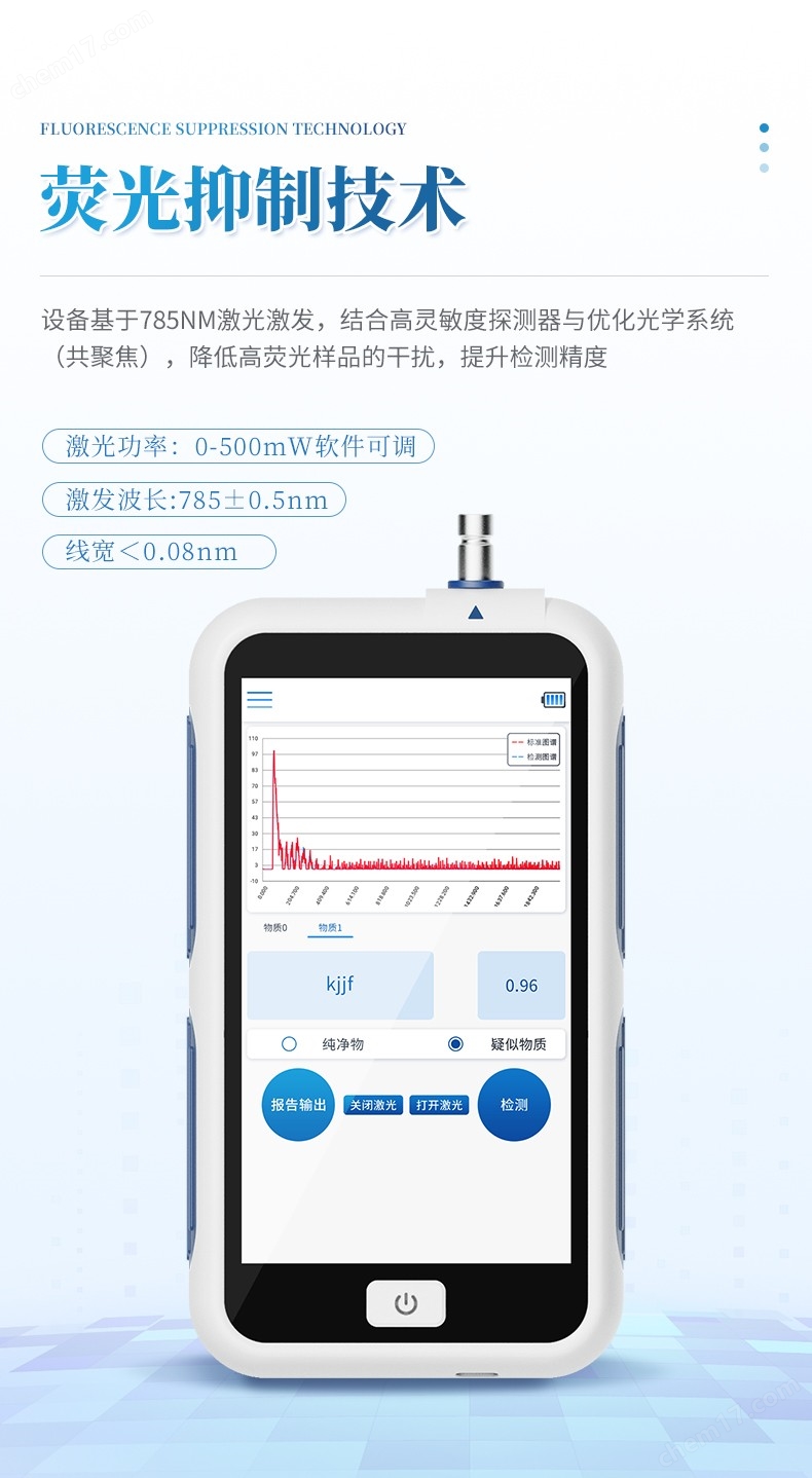 高效檢測(cè):一鍵式操作,3秒內(nèi)完成光譜采集(500ms積分時(shí)間),無(wú)需直接接觸樣品,可透過(guò)玻璃、塑封袋、飲料瓶等透明、半透明容器檢測(cè);支持疑似物分析及用戶自建譜圖庫(kù)(內(nèi)置標(biāo)準(zhǔn)譜圖);