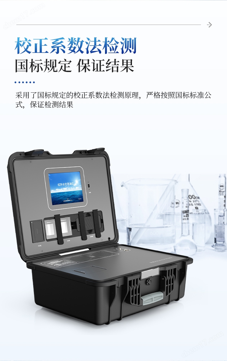 1)本產(chǎn)品采用了國(guó)標(biāo)規(guī)定的校正系數(shù)法檢測(cè)原理,嚴(yán)格按照國(guó)標(biāo)標(biāo)準(zhǔn)公式,使用20mg/L正十六烷,20mg/L異辛烷,100mg/L苯進(jìn)行校準(zhǔn),最終帶入校準(zhǔn)公式算出儀器校正系數(shù)進(jìn)行測(cè)量樣品(也可以使用標(biāo)準(zhǔn)曲線法進(jìn)行檢測(cè));