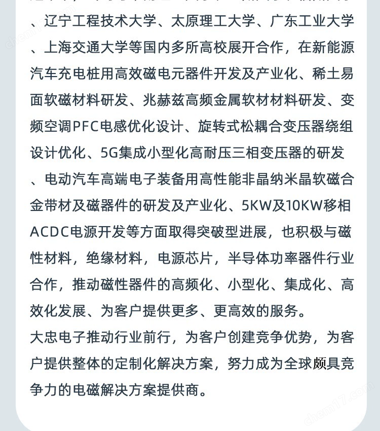 近年來(lái),公司與華南理工大學(xué)、蘭州大學(xué)、福州大學(xué)、遼寧工程技術(shù)大學(xué)、太原理工大學(xué)、廣東工業(yè)大學(xué)、上海交通大學(xué)等國(guó)內(nèi)多所高校展開(kāi)合作,在新能源汽車充電樁用高效磁電元器件開(kāi)發(fā)及產(chǎn)業(yè)化、稀土易面軟磁材料研發(fā)、兆赫茲高頻金屬軟材材料研發(fā)、變頻空調(diào)PFC電感優(yōu)化設(shè)計(jì)、旋轉(zhuǎn)式松耦合變壓器繞組設(shè)計(jì)優(yōu)化、5G集成小型化高耐壓三相變壓器的研發(fā)、電動(dòng)汽車電子裝備用高性能非晶納米晶軟磁合金帶材及磁器件的研發(fā)及產(chǎn)業(yè)化、5kW及10kW移相ACDC電源開(kāi)發(fā)等方面取得突破型進(jìn)展,也積極與磁性材料,絕緣材料,電源芯片,半導(dǎo)體功率器件行業(yè)合作,推動(dòng)磁性器件的高頻化、小型化、集成化、高效化發(fā)展、為客戶提供更多、更高效的服務(wù)。