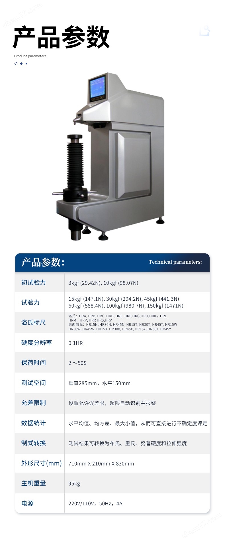 | 試驗力 | 15kgf (147.1N), 30kgf (294.2N), 45kgf (441.3N),60kgf (588.4N), 100kgf (980.7N), 150kgf (1471N) |