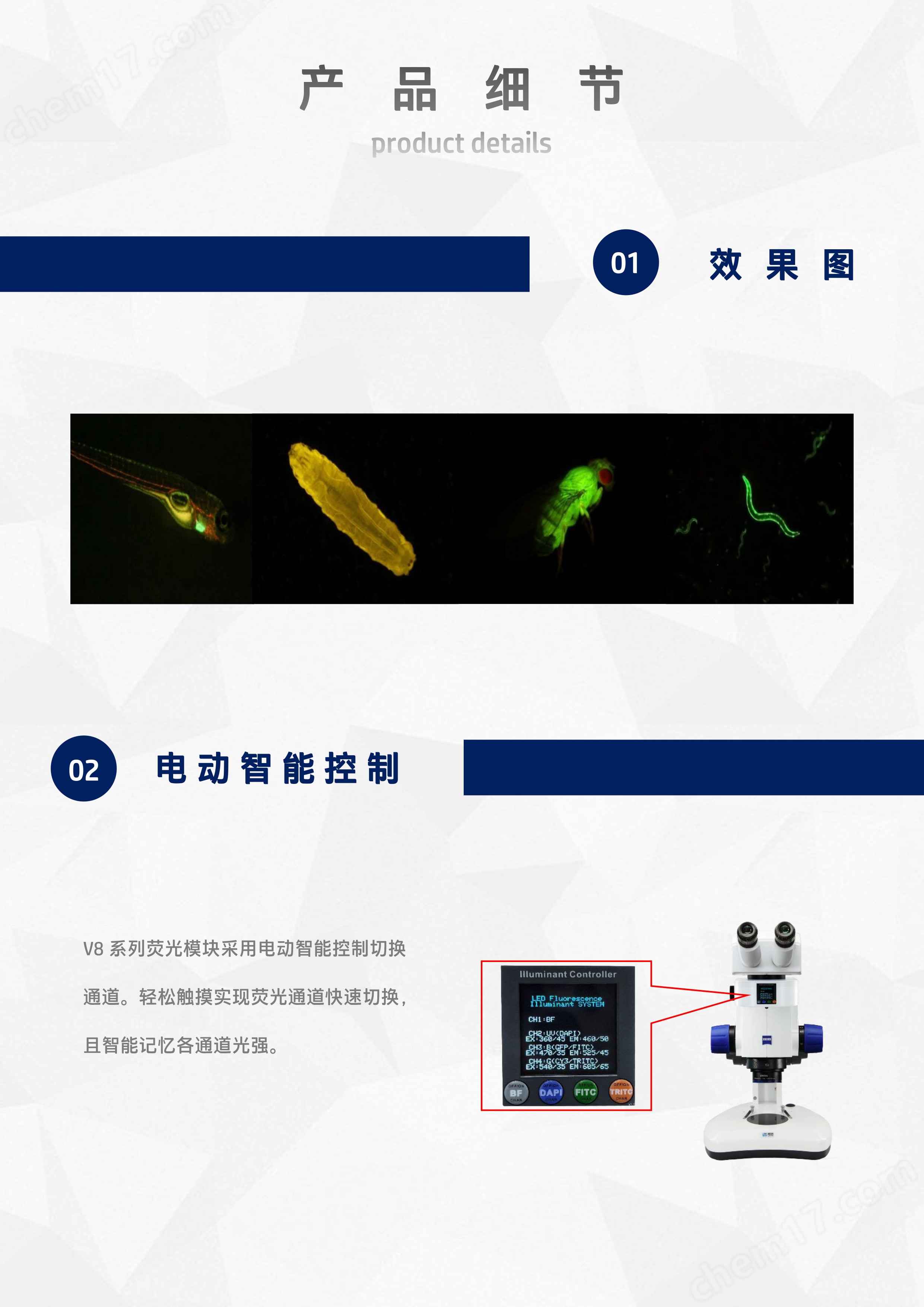 ZEISS Discovery.V8體視顯微鏡熒光模塊附件作為ZEISS Discovery.V16體視顯微鏡的核心升級組件,這款LED熒光附件憑借電動控制與LED光源技術(shù)的深度融合,為科研觀測與精密檢測提供了高效、穩(wěn)定的熒光成像解決方案。其核心優(yōu)勢集中體現(xiàn)在電動控制熒光通道轉(zhuǎn)換與高性能LED光源兩大核心特性,適配生命科學、材料檢測等多領(lǐng)域的精準觀測需求。