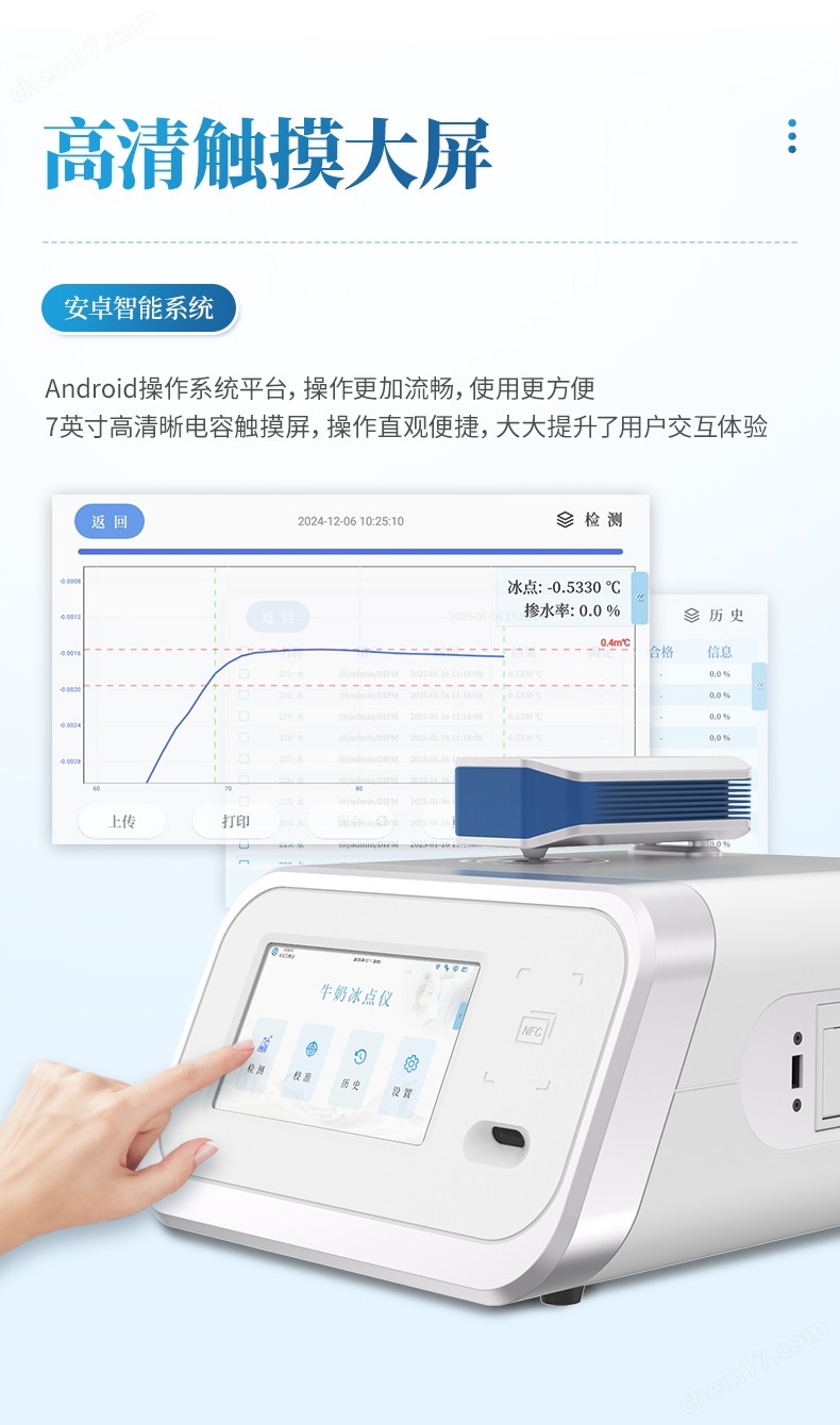 本產(chǎn)品專為監(jiān)測生鮮乳品冰點而設計,依托優(yōu)良的熱敏電阻技術,可全程高精度檢測溫度變化,精準提取牛奶冷卻結晶的臨界點,以科學方法揭示樣品中潛在的水分摻雜情況。冰點的細微變化,是衡量牛奶純度與品質(zhì)的直觀標尺,對于乳品加工行業(yè)、質(zhì)量監(jiān)控實驗室及科研單位而言,本產(chǎn)品是確保乳品品質(zhì)、提升檢測效率的得力工具。
