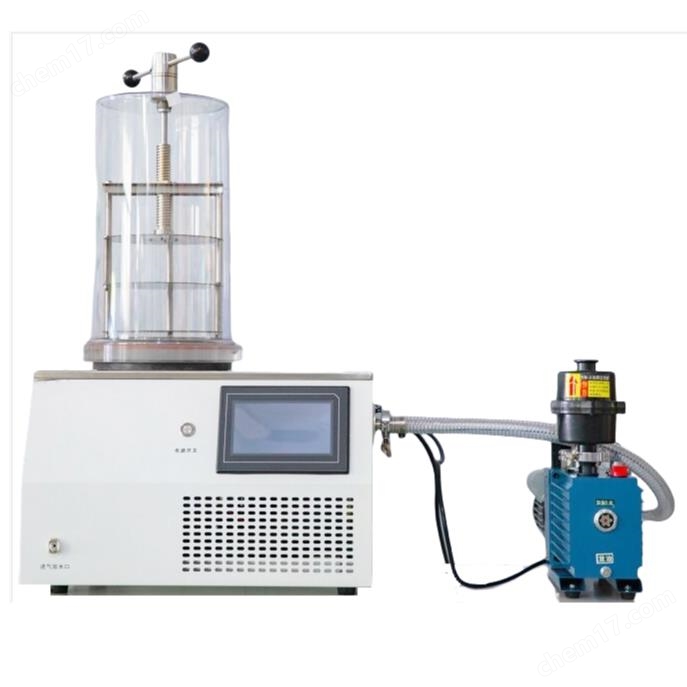 鐘罩型凍干機:凍干腔和冷阱為分立的上下結(jié)構(gòu),凍干腔沒有預(yù)凍功能。該類型的凍干機在物料預(yù)凍結(jié)束后轉(zhuǎn)入干燥過程時需要人工操作。大部分實驗型凍干機都為鐘罩型,其結(jié)構(gòu)簡單、造價低。凍干腔多數(shù)使用透明有機玻璃罩,便于觀察物料的凍干情況。