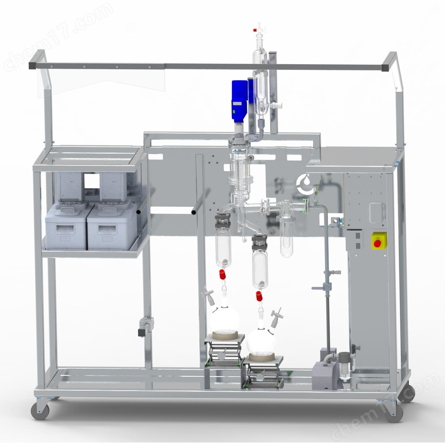 在一臺玻璃材質(zhì)設(shè)備中進(jìn)行短程蒸餾,其刮膜加熱面積為 0.05 平方米。KDL5 設(shè)備適用于在蒸發(fā)器溫度最高達(dá) 300°C 攝氏度、減壓條件z低至10的負(fù)3次方mbar的情況下,實(shí)現(xiàn)每小時高達(dá) 1.5 千克的處理量。