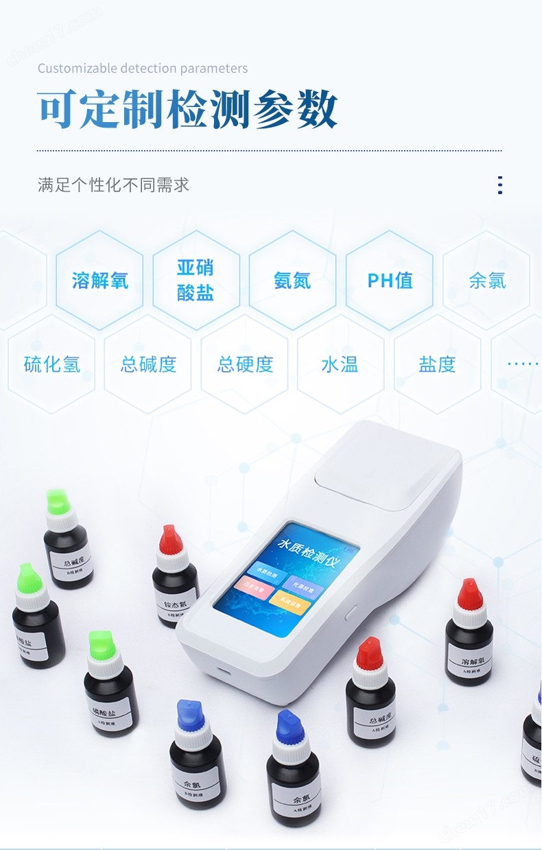 提取一定量水體樣品,經(jīng)過前處理后根據(jù)不同檢測項目按照試劑說明書滴入檢測試劑,檢測試劑會與水體中的待測物質(zhì)發(fā)生反應(yīng),反應(yīng)液呈現(xiàn)特定的顏色。