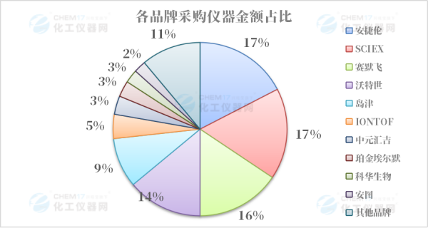 “各品牌采購(gòu)儀器金額占比”主要展示了中標(biāo)金額排名前10的品牌,其余歸為其他品牌。在10月中標(biāo)的30個(gè)品牌中,安捷倫、SCIEX、賽默飛三個(gè)品牌的市場(chǎng)份額依舊占據(jù)了“半壁江山”,三個(gè)品牌的中標(biāo)金額共占了總金額的50%,中標(biāo)金額分別為6913.16985萬(wàn)元、6755.795萬(wàn)元、6194.957萬(wàn)元。
