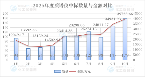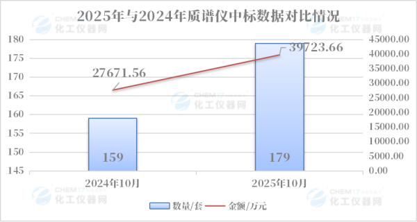 從“2025年與2024年質(zhì)譜儀中標(biāo)數(shù)據(jù)對(duì)比情況”中可以看出,2025年質(zhì)譜儀市場(chǎng)需求依舊持續(xù)增長(zhǎng)。2025年10月中國(guó)政府采購(gòu)網(wǎng)可統(tǒng)計(jì)到的質(zhì)譜儀中標(biāo)數(shù)量為179套,同比增長(zhǎng)12.57%;中標(biāo)金額為39723.66萬(wàn)元,同比增長(zhǎng)43.55%。