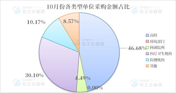 結(jié)合“各類型單位采購(gòu)儀器數(shù)量及采購(gòu)平均單價(jià)”和“各類型單位采購(gòu)金額占比”,無(wú)論是采購(gòu)數(shù)量還是采購(gòu)金額,高校均為榜首,采購(gòu)數(shù)量為68套,占采購(gòu)總數(shù)量的38.42%;采購(gòu)金額為18412.29301624萬(wàn)元,占采購(gòu)總金額的46.68%,近10月份各類型單位采購(gòu)總金額的一半占比。10月質(zhì)譜儀市場(chǎng)來(lái)看,高校對(duì)高端質(zhì)譜儀的需求更突出。