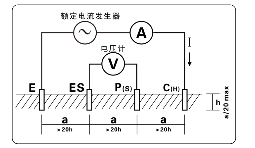 土壤電阻率(ρ)測量采用4極法(溫納法):E接地極與C(H)電流極間流動交流電流I,求P(S)電壓極與ES輔助地極間的電位差V,電位差V除以交流電流I得到接地電阻值R,電極間隔距離為a(m),根據(jù)公式ρ=2πaR(Ωm)得出土壤電阻率的值,C(H)-P(S)的間距與P(S)-ES的間距相等時(都為a)即為溫納法。為了計算方便,請讓電極間距a遠大于埋設深度h,一般應滿足a>20h,見下圖: