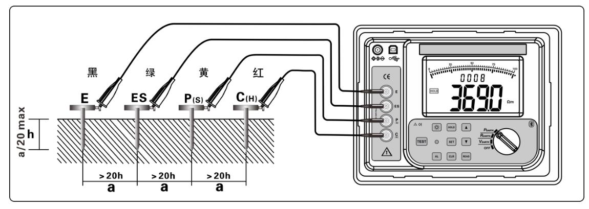 四極法(溫納法):按下圖連接測試線,注意輔助接地樁間的間距及埋入深度,分別將C(H)、P(S)、ES、E輔助接地樁呈一直線深埋入大地,將接地測試線(紅、黃、綠、黑)從儀表的C(H)、P(S)、ES、E接口開始對應連接到被測C(H)、P(S)、ES、E輔助接地樁上。
