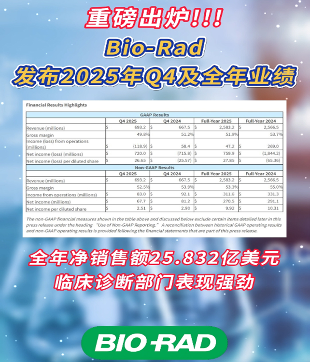 Bio-Rad近日公布了截至2025年12月31日的第四季度及全年財(cái)務(wù)業(yè)績。報(bào)告顯示,公司在面臨學(xué)術(shù)研究資金受限和地緣政治不確定性的挑戰(zhàn)性市場(chǎng)環(huán)境下,實(shí)現(xiàn)了溫和的營收增長和強(qiáng)勁的自由現(xiàn)金流。